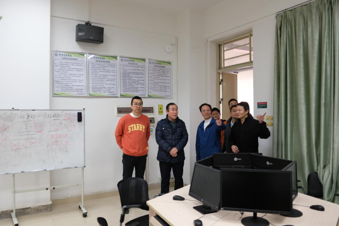 ▲检查组一行巡查学校网络总机房,要求加强网络安全应急处置工作,并对网络机房、通讯线路、消防等重要设施进行排查,消除安全隐患