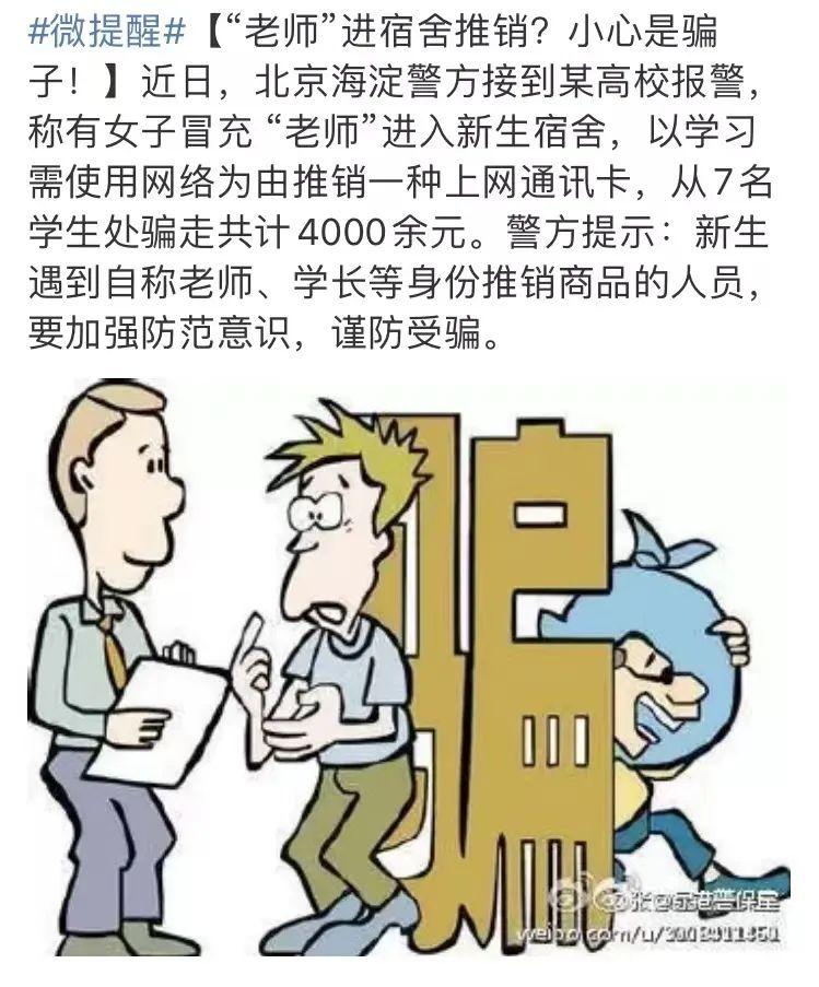 警惕找上门的冒牌老师,骗子往往会假扮老师的身份,前往寝室实施诈骗,而同学们刚进校园,有可能还没知道老师是谁,一听是老师上门收费,二话不说就把钱交到骗子的手上。这个“老师”是谁,没人认识。最后才发现被骗了。