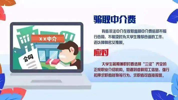 一些黑中介会在人多的地带租一间门店,将自己伪装成兼职中介,以帮忙找兼职、暑假工为由,借各种各样的名义来收取学生的会费、报名费等一系列费用。一旦缴费,学生要么直接拉入黑名单,要么收到的都是没用的工作信息