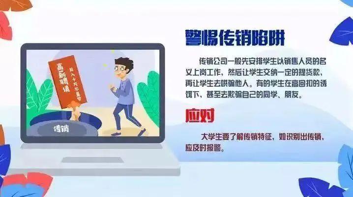 传销是目前大学生打工中经常遇到的陷阱,一般是以做销售的名义诱骗大学生去工作,然后公司强制让学生购买一定数量的产品,并且对学生们进行洗脑,再让学生去说服自己的同学和亲友购买公司产品,一些防范意识薄弱的同学很快加入传销群体,而且在高回扣的诱饵下,甚至去欺骗自己的同学、朋友。