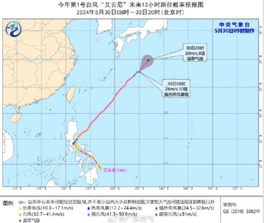 30日08时,今年第1号台风“艾云尼”中心位于琉球群岛那霸市东偏北方向约740公里的西北太平洋洋面上,中心附近最大风力有10级(28米/秒)。预计,“艾云尼”将以每小时20-25公里的速度继续向东北方向移动,强度逐渐减弱。